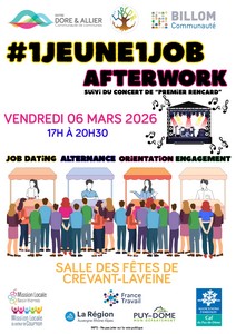 Billom Communauté, en partenariat avec Entre Dore et Allier, organisent une nouvelle édition du forum 1jeune1job sous un format afterwork, spécialement pensé pour les jeunes adultes du territoire. L’événement se déroulera vendredi 6 mars, de 17h à 20h30, à Crevant-Laveine, et se clôturera par un concert.