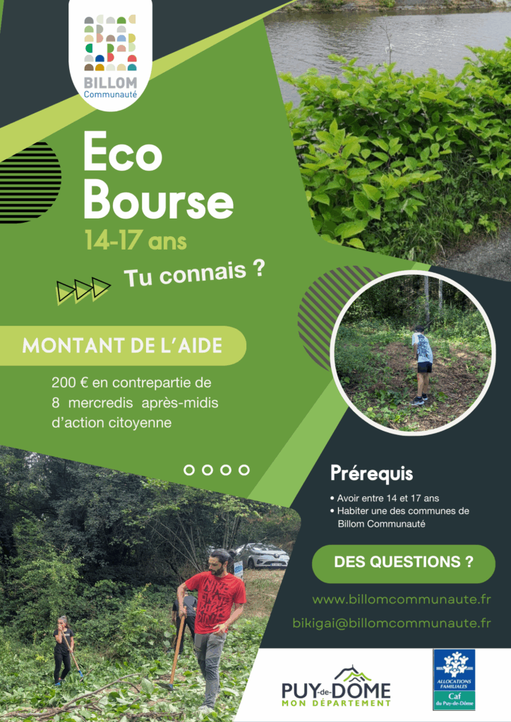 Billom Communauté te propose de bénéficier de l'Eco-Bourse (jusqu'à 200 €) en échange de 8 mercredis après-midis de ton temps pour des tâches en lien avec l'environnement.